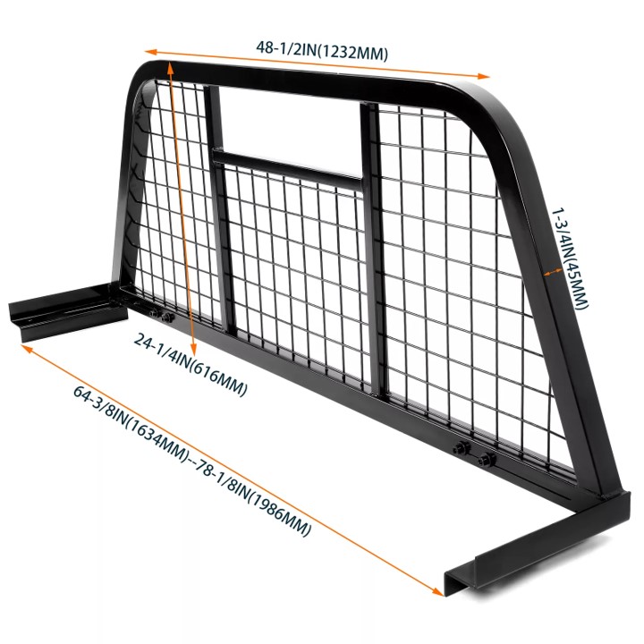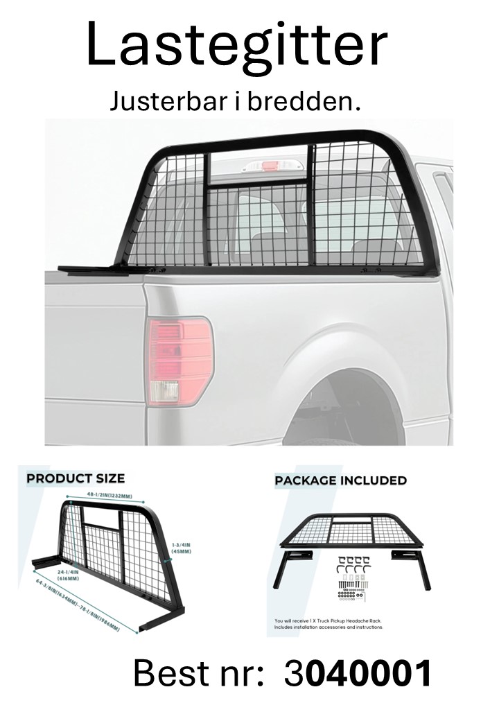 Praktisk lastegitter som beskytter bakruten og førerhuset mot last som sklir fremover i planet. Gitteret er justerbart i bredden fra 164 til 198 cm, og kan tilpasses en rekke pickup-modeller – fra Amarok og Ranger til F-150/Lightning, Colorado/Silverado, RAM og lignende biler i samme størrelse.