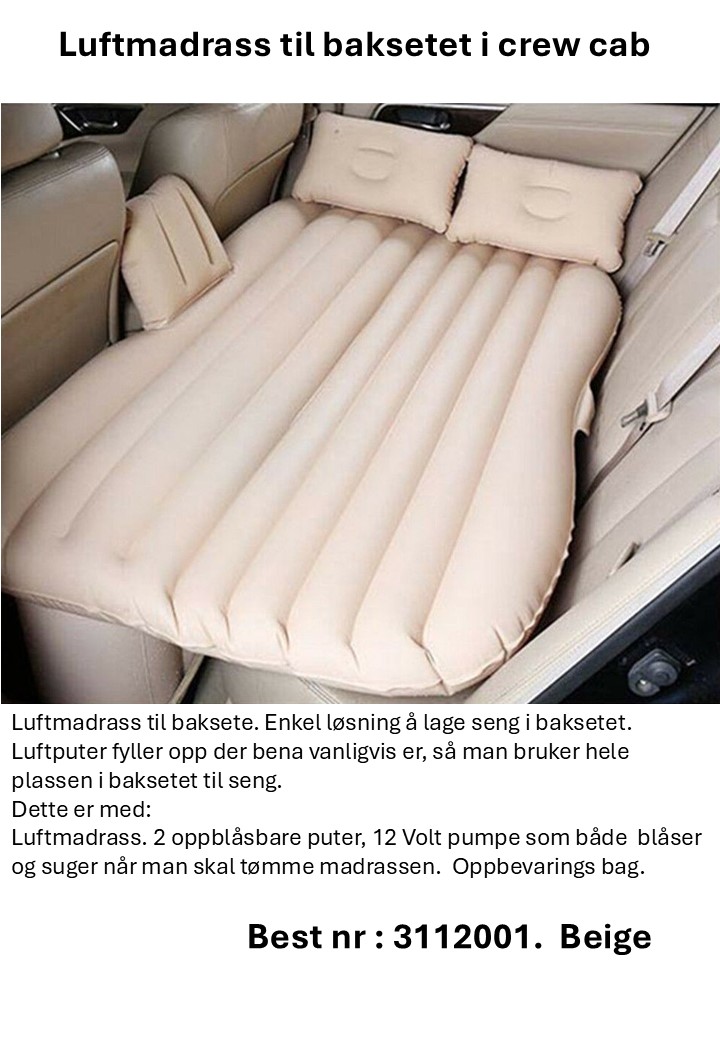 Settet inneholder tykk luftmadrass, 2 oppblåsbare puter, 12V kompressor/luftpumpe og praktisk bærebag. Vekt ca. 4,5 kg. Kan med fordel kombineres med telt for lasteplanet for et komplett campingoppsett.