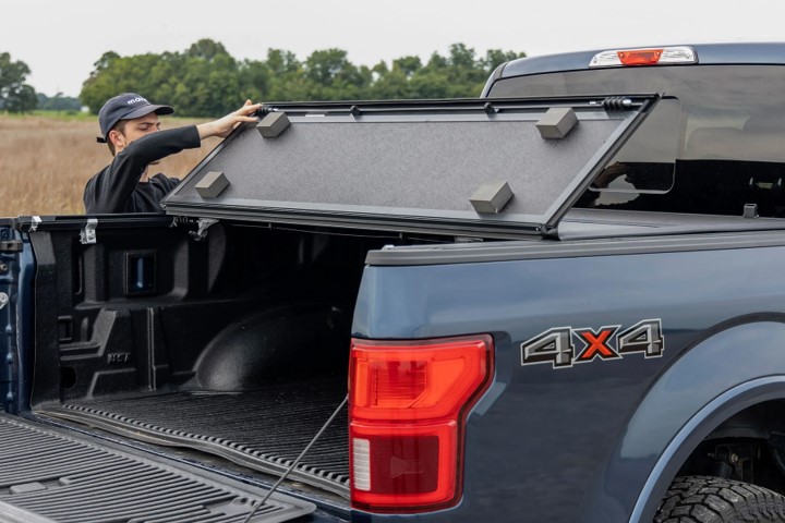 Dette er en solid og smekker utgave av 3 delt lavprofil hardcover. Denne folder seg som vist på bildene. Den kan ikke åpnes uten å først å åpne bakluken. Monteres med klemmer uten å måtte borre eller skru i bilen.